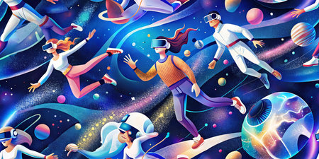 Virtual reality adventure in space with futuristic characters and planets.