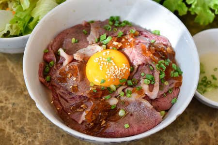 Japanese grilled meat on rice, Beef sliced yakiniku set, BBQ korean roast, Asian traditional food.