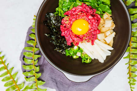 Yukhoebibimbap, Korean style Beef Tartare Bibimbap : This is a bowl of rice topped with seasonal namul (seasoned vegetables) and fresh yukhoe (chopped raw beef) and served with seasoning. Lean fresh rump or eye of round is the preferred cut for this dish.