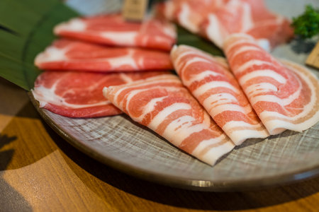 Raw pork neck sliced on plate for shabu, hot pot ingredients. Close up