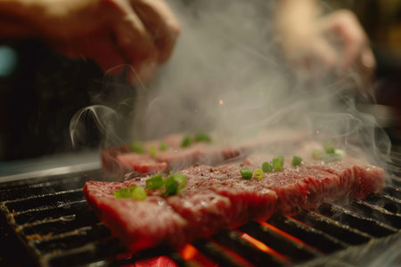 Japanese grilled marble meat, A5 Wagyu beef slice yakiniku, BBQ korean roast, Asian traditional food.