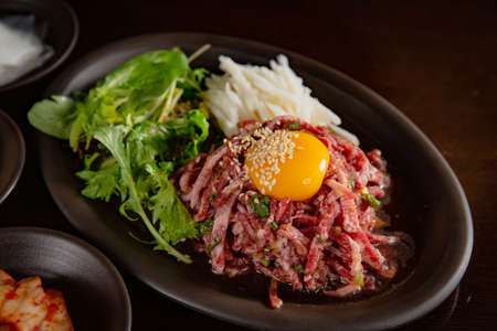 Korean Grilled BBQ combo sets with egg yolk beef tartare with pickle salad on the dark plate and black table vibe background, and pickle dishes
