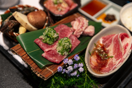 Premium Japanese sliced wagyu beef on plate for yakiniku. Luxury beef menu