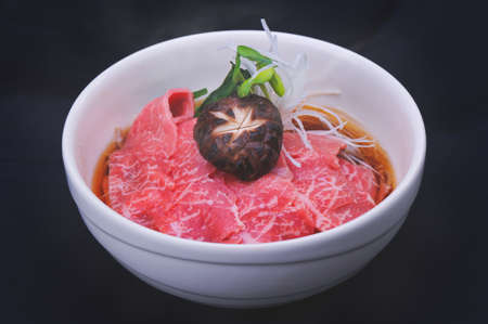 Niku soba Japanese style raw beef with noodle and hot shoyu soup in dark background.