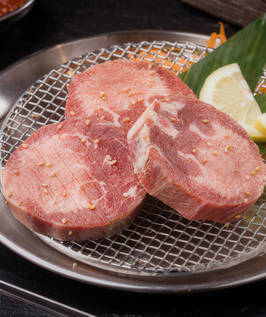 Grilled Ox Tongue Beef Sizzling on a Charcoal Grill for Korean BBQ, Creating Smoky and Juicy Flavors Enhanced by Traditional Grilling Techniques