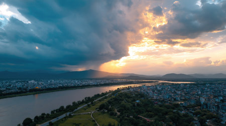 A stunning aerial perspective capturing the sunset over a vibrant cityscape, flanked by a river and mountains. Dramatic clouds create a breathtaking atmosphere.