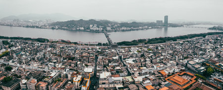 Quanzhou city aerial view including historic Licheng district and Xihu (West Lake) Park, from top of Mount Qingyuan, Quanzhou, Fujian Province, China.