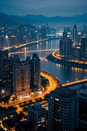 Panoramic view of the city at dusk and riverside night view