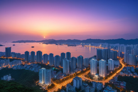 a bird's eye view of the beautiful coastal city in xiamen at dusk