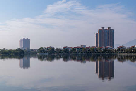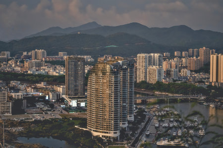 Sanya, Hainan, China - 26.06.2019: Sanya Cityscape with Sanya River View and Apartment Buildings in the sunset time in Hainan Province, China