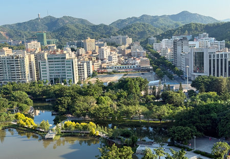 In the morning, the southern city of China is bathed in sunshine, with undulating mountains, dense forests, crowded buildings and clear pool water, a city waking up.