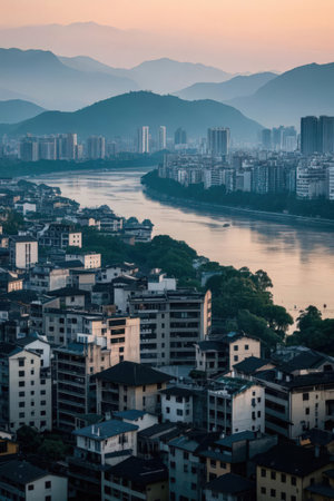 Ancient and modern urban architecture and river landscape