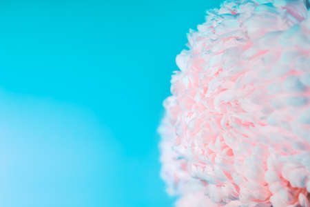 Close-up pink bud petals flower on blue background with copy space. Banner with lush chrysanthemum, peony, rose or carnation plant. Holiday mockup design of gift certificate. mother day card template.