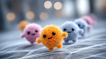 In a charming setting, vibrant fuzzy creatures of various colors joyfully explore their surroundings, showcasing soft textures and a playful atmosphere. The gentle lighting adds to the enchantment.