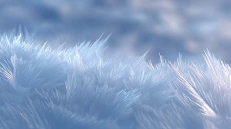 Explore the delicate beauty of frosty ice crystals across a cold winter surface. The soft blue background enhances the tranquil and serene atmosphere.