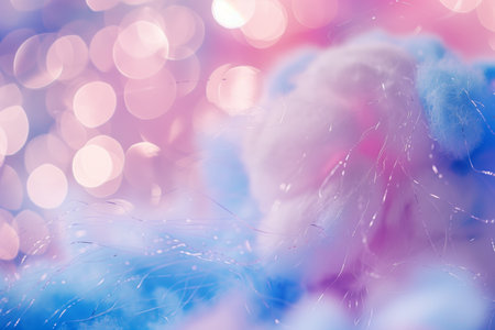 A detailed macro photograph depicting soft pastel cotton candy with glowing bokeh and delicate threads, evoking a whimsical, sweet, and dreamy aesthetic.