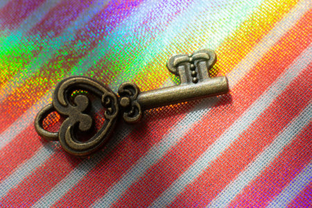 Vintage key. .Antique key. Retro key on colorful fabric background