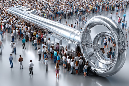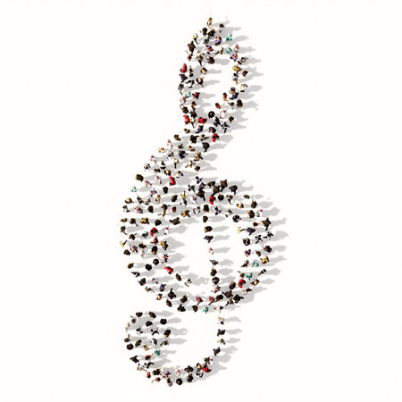 Concept or conceptual large community of people forming the image of a musical note on white background. A 3d illustration metaphor for music, concert, accoustic, orchestra, education and culture