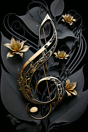 Vintage luxurious floral background with golden lily flowers. Treble clef and musical notes romantic design template.