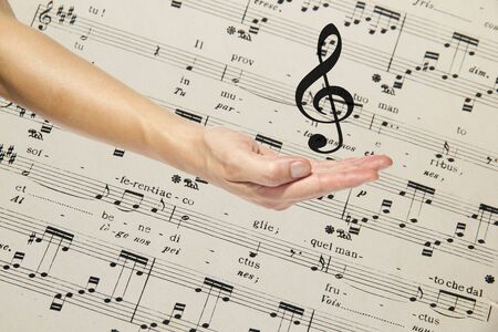 Man hand holds musical note treble clef and notes background. Music education concept