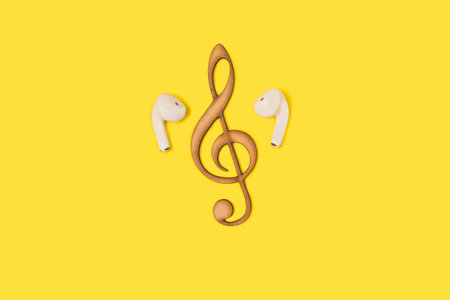 A plastic treble clef with wireless earphones on a yellow background