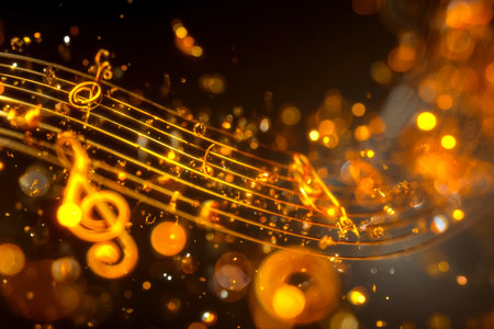 Dynamic golden glow highlights shimmering musical notes and staff, surrounded by blurred light bursts, evoking an energetic, uplifting musical atmosph