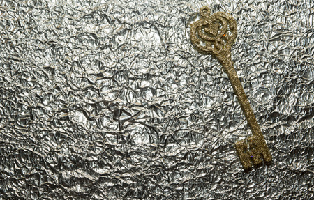 Golden key on a background of aluminum foil. Christmas toy key covered in sequins.