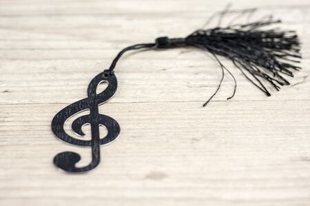 Black treble key or clef sign macro close-up printed on a musical chart or partition. Toned image.