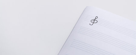 Treble clear on paper. Notebook for music. Banner. copyspace.