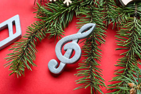 Treble clef made of fir tree branches on color background