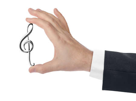 Mans hand holds violin key and notes on white background. Treble clef. Key of G