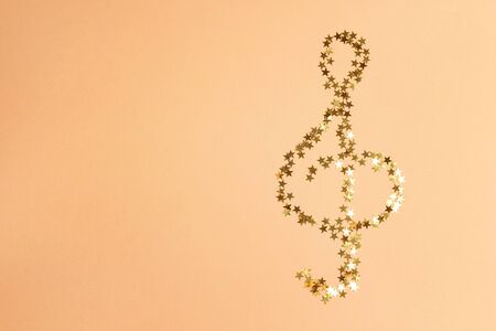 Treble clef made of golden small stars on a yellow background with copy space.