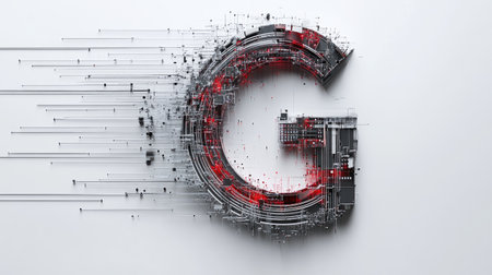 The letter G designed with futuristic technology elements, such as microchips and digital grids, standing out on a minimalist white background.