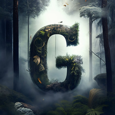 Graphic alphabet letters: Letter G in the forest. 3D rendering. Fantasy illustration.