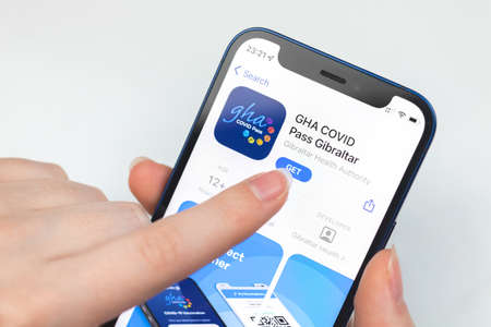 Kharkov, Ukraine - January 10, 2022: GHA COVID Pass Gibraltar app icon closeup. Woman uses the application on Apple iPhone 12
