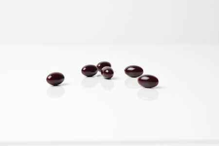 Heap of red pills on colored background. Tablets scattered on a table. Pile of red soft gelatin capsule. Vitamins and dietary supplements concept.