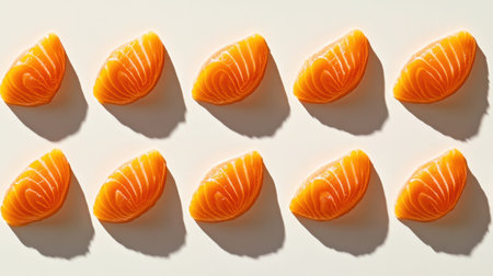 Delight in the vibrant beauty of fresh sushi-grade salmon slices arranged elegantly, capturing the essence of culinary artistry and healthy dining.