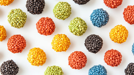 Colorful round candy confections displayed on a white surface in a variety of vibrant colors and textures