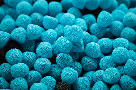 Background - assortment of delicious marmalade jelly candies for sale on counter of shop, grocery, market, cafe. Dessert, copy space, sweet food, pattern and confectionery concept