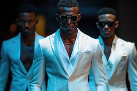 Young model in elegant attire poses confidently on stage during a fashion show at a venue with spotlighted background
