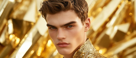 Confident rapper with golden jewelry posing in an opulent baroque-style room