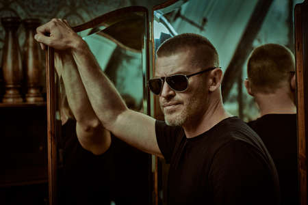 Portrait of a handsome brutal mature man with short hair and bristles wearing trendy sunglasses against the background of the mirror in the apartment. Manly style. Optics for men.