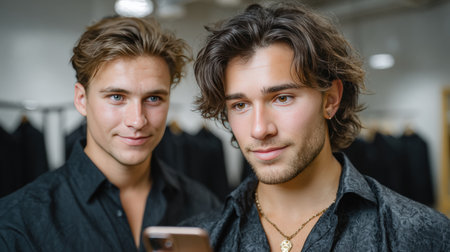 Two young men are looking closely at a smartphone held by the man in the foreground. The man in the foreground has dark, wavy hair and is wearing a black patterned shirt and a gold necklace. The man behind him has lighter brown hair and is wearing a black shirt. Both have engaged expressions. The background is blurred, suggesting an indoor setting like an office or a studio.