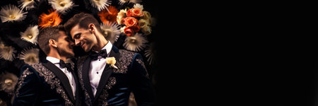 Gay wedding celebration with couple, elegant banner design with copy space for LGBTQ love and equality themes