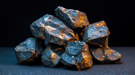 This image showcases a close-up of dark-colored, rough-textured stones. The composition features a shallow depth of field, emphasizing the texture and details. The colors are predominantly cool tones with a moody atmosphere. Suitable for various creative and commercial applications, the image presents a natural, rugged aesthetic.