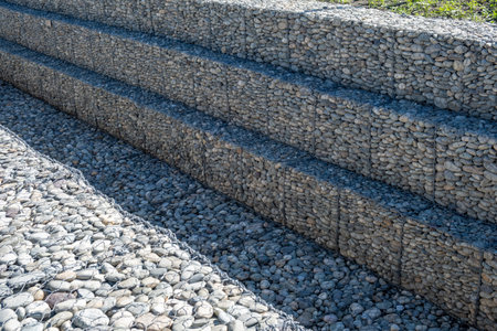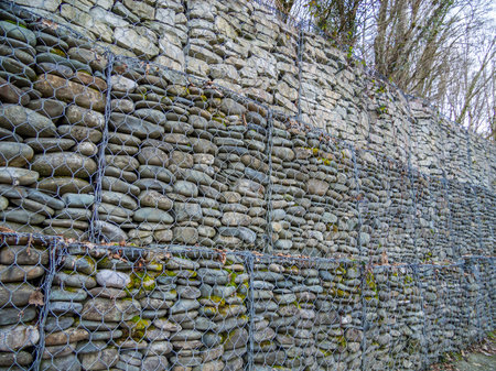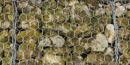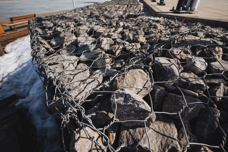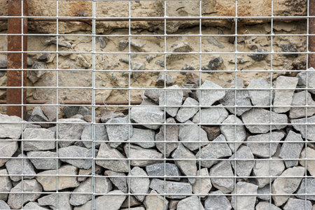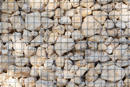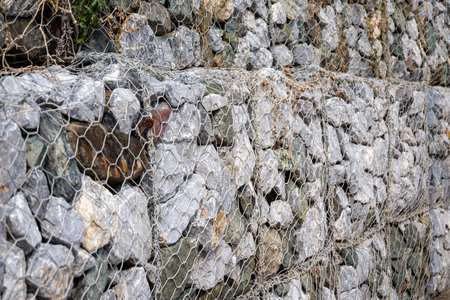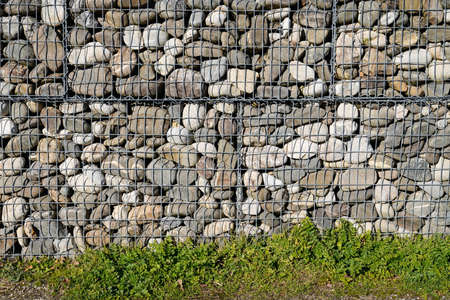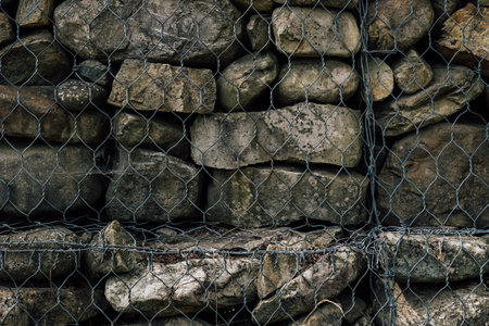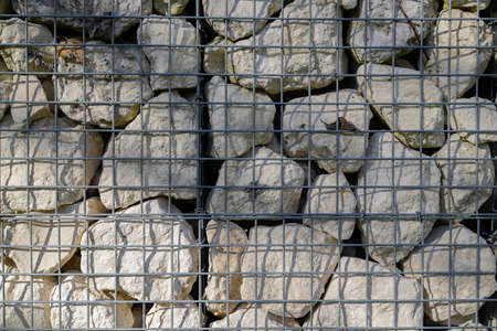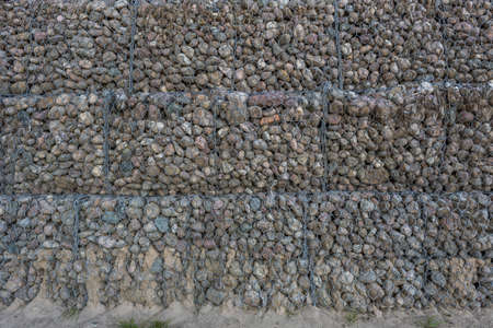 Beautiful close up high resolution view of gabion wall rocks and stones in metal wire box cage along M-50 motorway for slope and earth retention management in Dublin, IrelandBeautiful close up high resolution view of gabion wall rocks and stones in metal wire box cage along M-50 motorway for slope and earth retention management in Dublin, Ireland