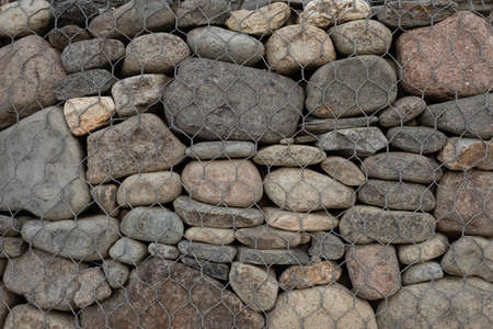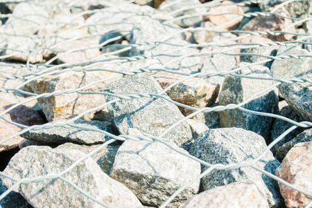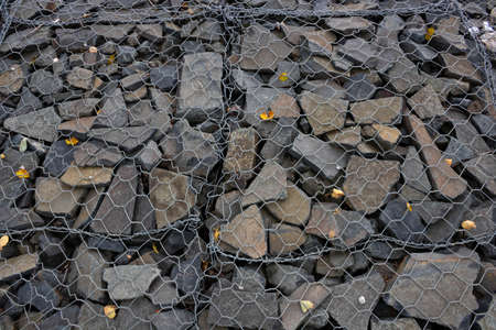 Granite stones behind a metal grate for strengthening the slope. Stones behind the wire. grey texture. construction.