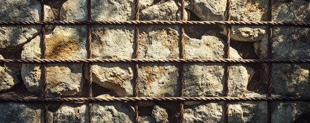 Gabion basket rock fill behind mesh coarse neutrals headline space wallpaper background representing industrial material detail suitable for modern architectural design