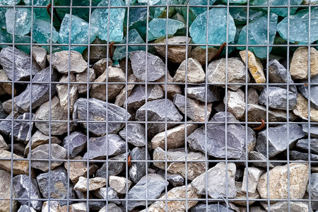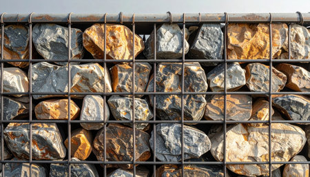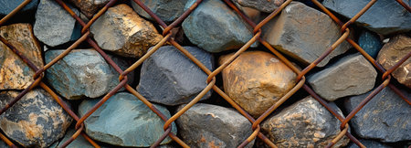 A close view of gray and black irregular stones secured by metal mesh, creating a rugged texture suitable for industrial and construction themes.