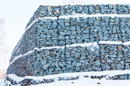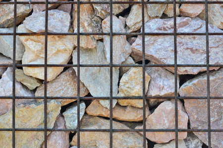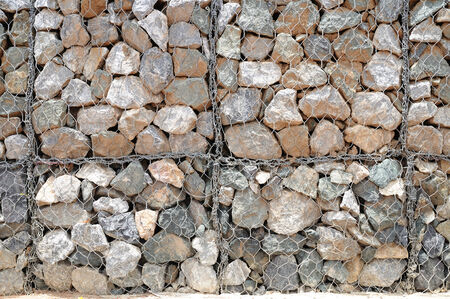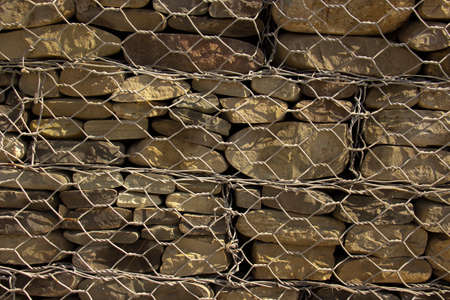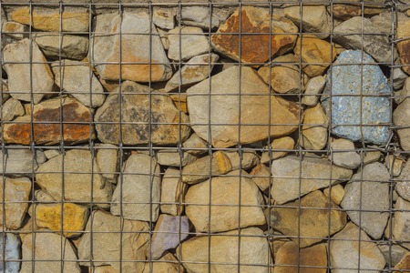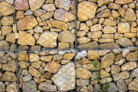 Detail shot of a stone retaining wall with stones in a steel cage. nobody.